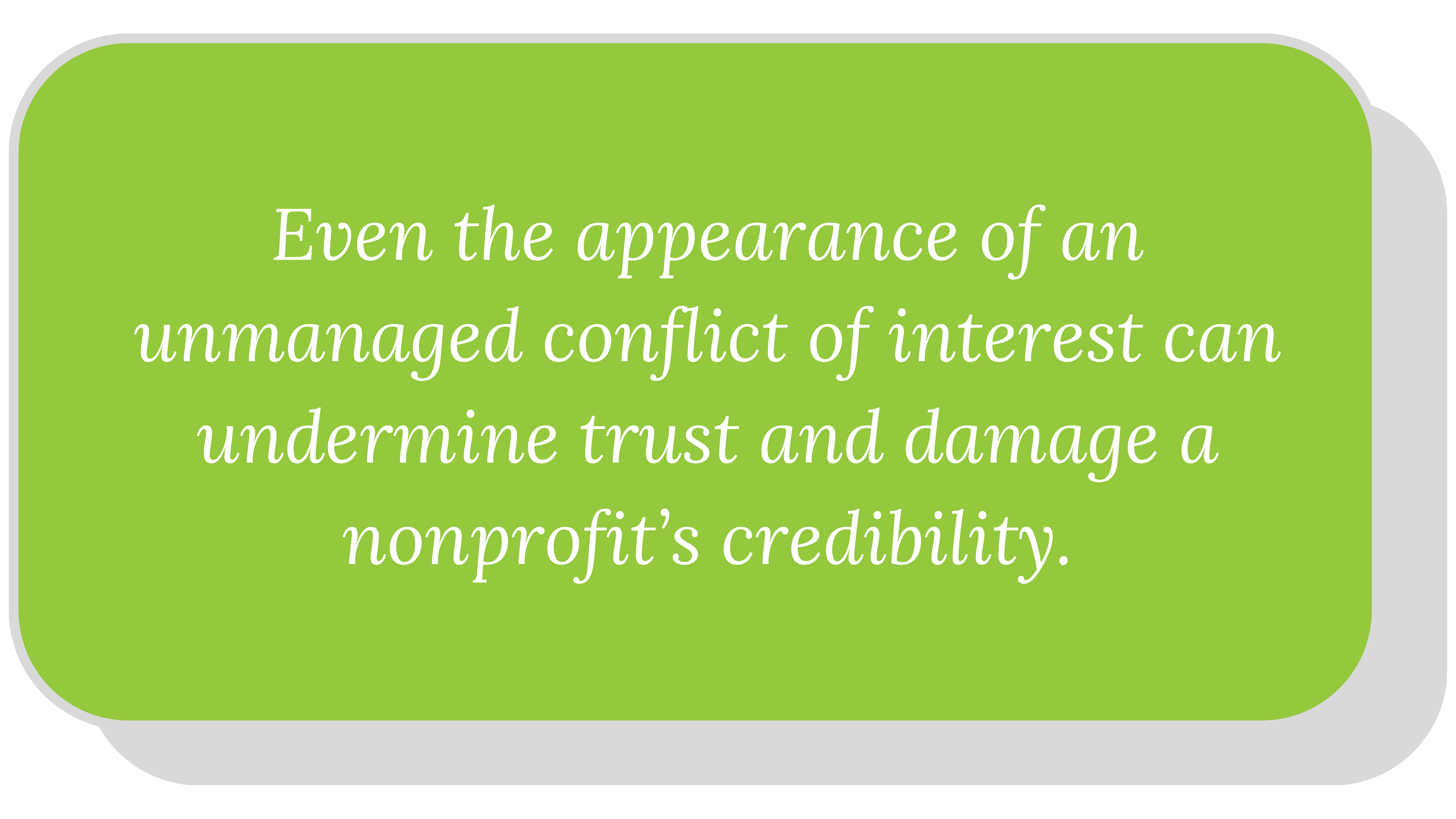 In a nonprofit organization, a conflict of interest arises when someone involved with the organization has a personal interest that could interfere — or appear to interfere — with the organization’s best interests.